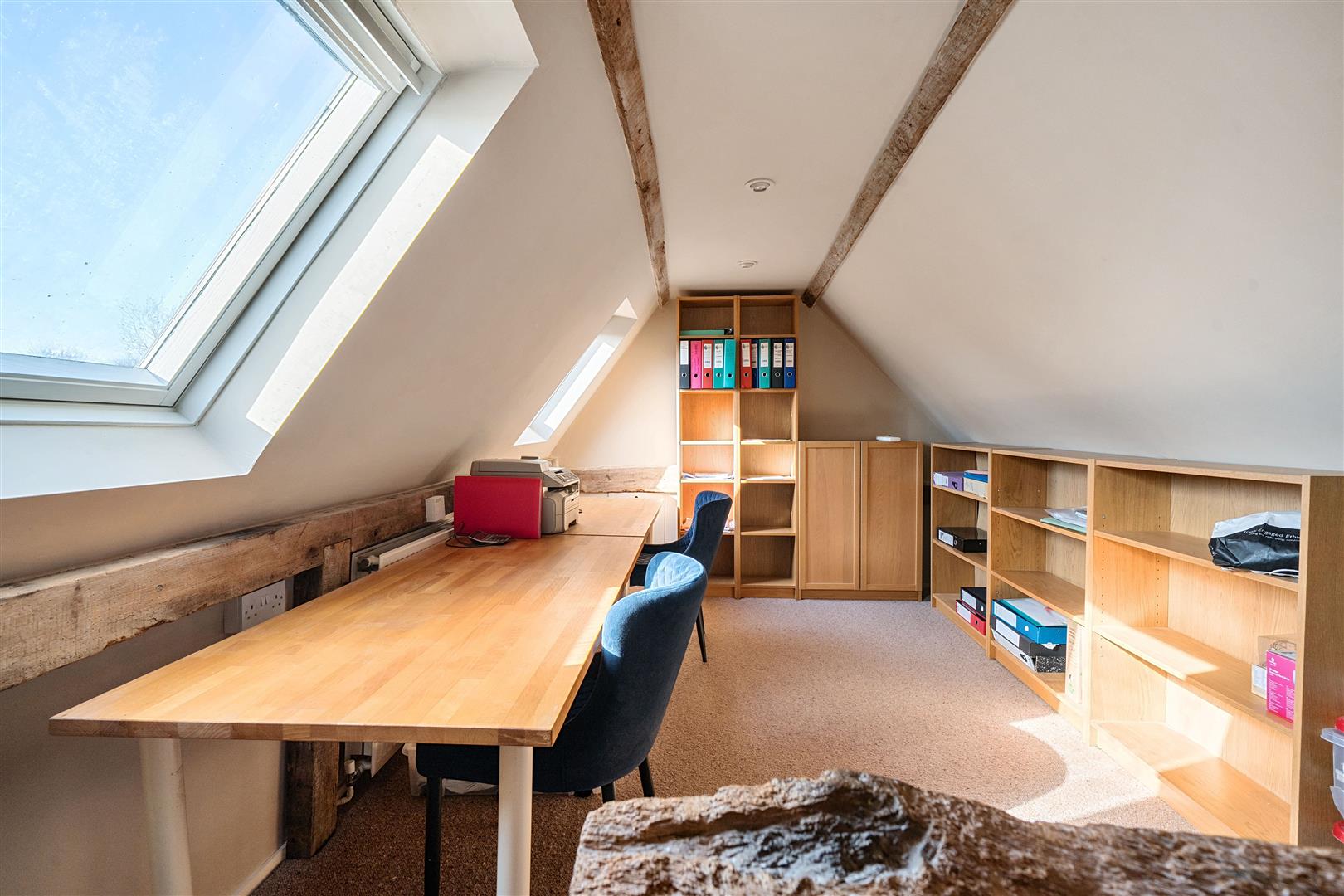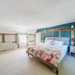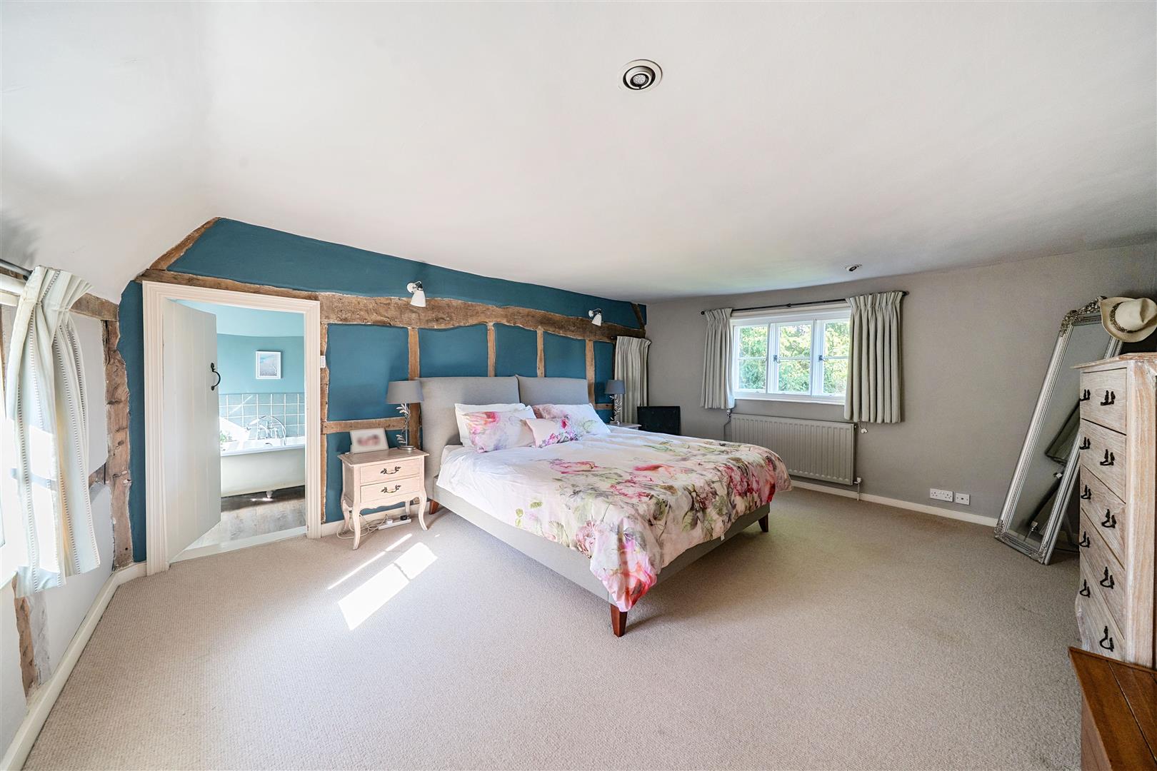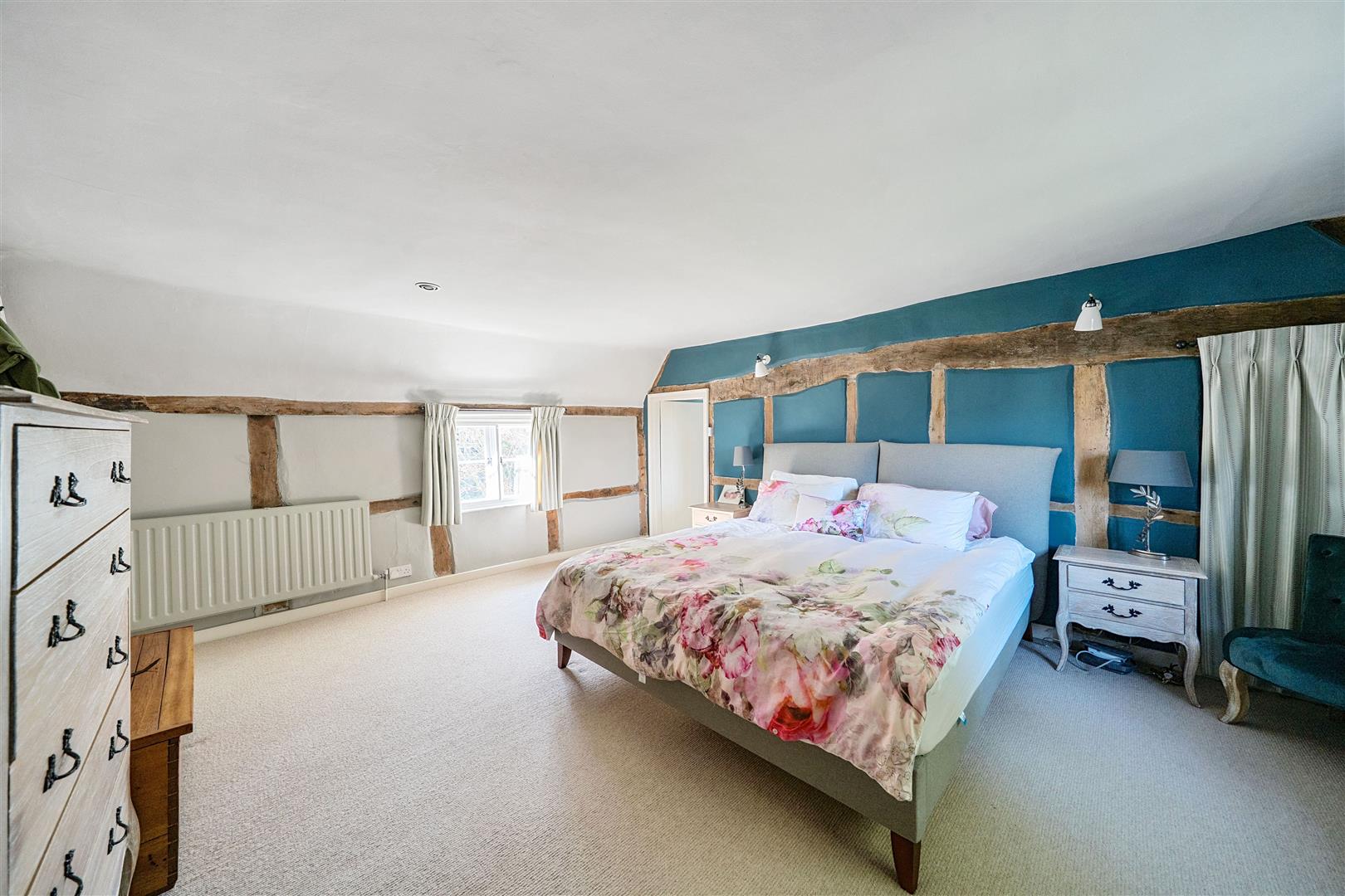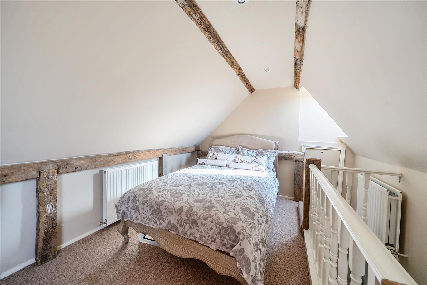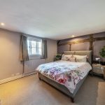 Upstairs there are four generous double bedrooms, two of which are en-suite. The master bedroom is a serene retreat, where exposed beams and soft neutral tones create an inviting atmosphere. Its chic en-suite bathroom, designed with heritage-style, features both a walk-in shower and a relaxing bathtub. The guest bedroom benefits from its own en-suite, while the remaining two double bedrooms share a well-appointed family bathroom with a freestanding bath and separate shower. A hidden staircase leads to a converted attic space—a 5th bedroom, ideal home office, playroom, or creative retreat, with additional loft storage.