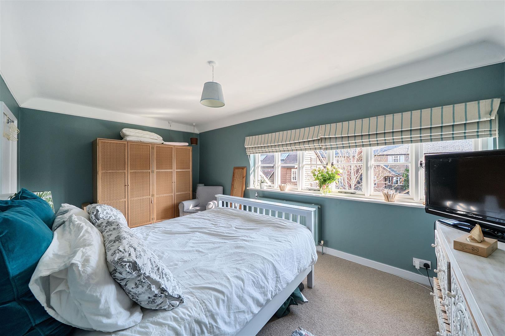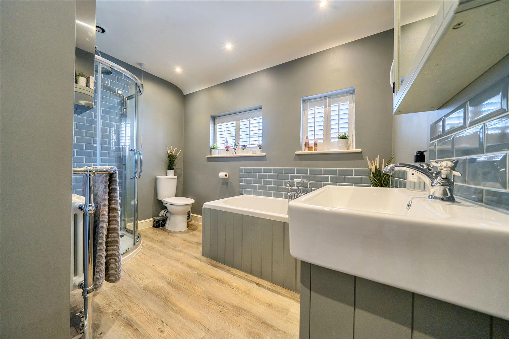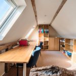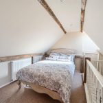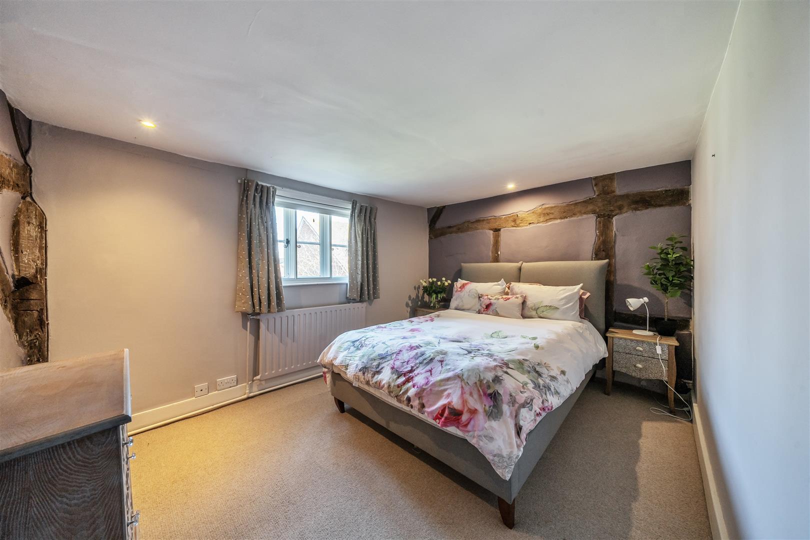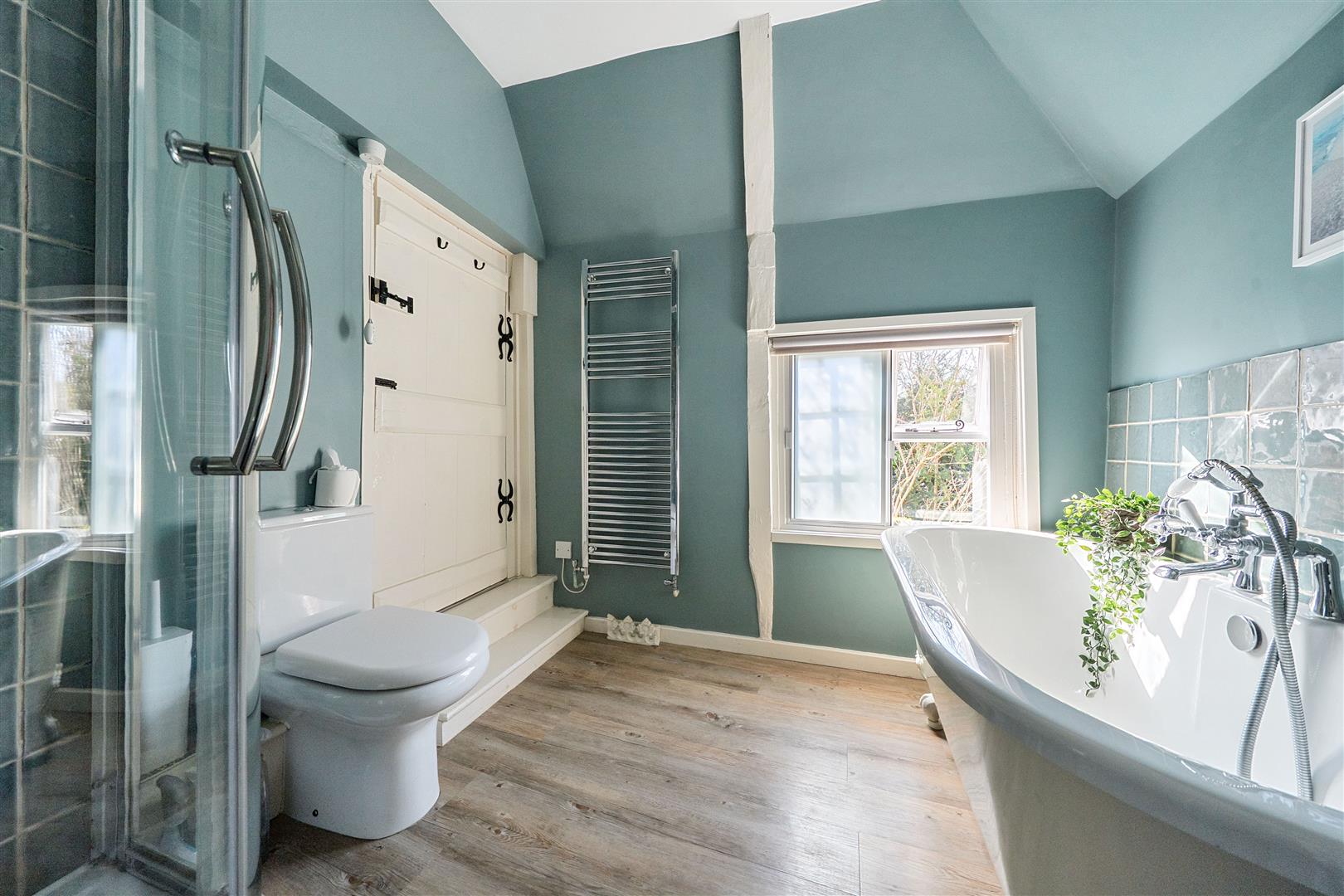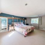 Upstairs there are four generous double bedrooms, two of which are en-suite. The master bedroom is a serene retreat, where exposed beams and soft neutral tones create an inviting atmosphere. Its chic en-suite bathroom, designed with heritage-style, features both a walk-in shower and a relaxing bathtub. The guest bedroom benefits from its own en-suite, while the remaining two double bedrooms share a well-appointed family bathroom with a freestanding bath and separate shower. A hidden staircase leads to a converted attic space—a 5th bedroom, ideal home office, playroom, or creative retreat, with additional loft storage.