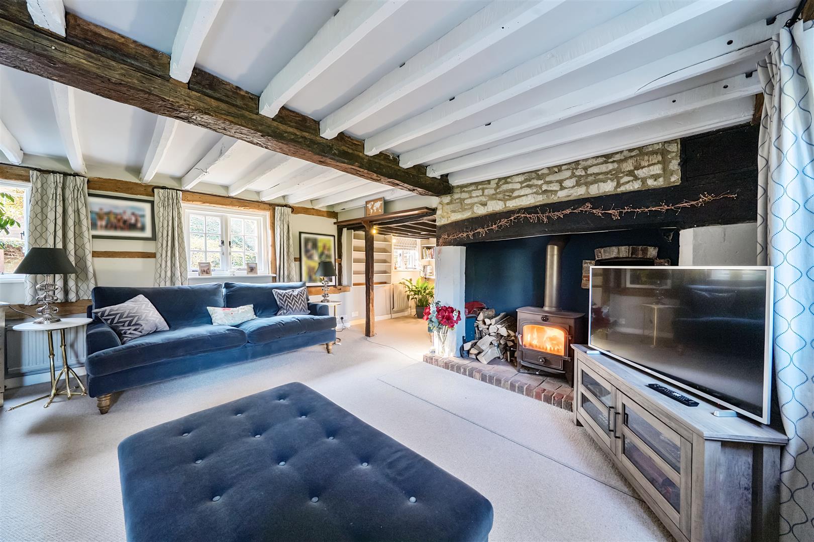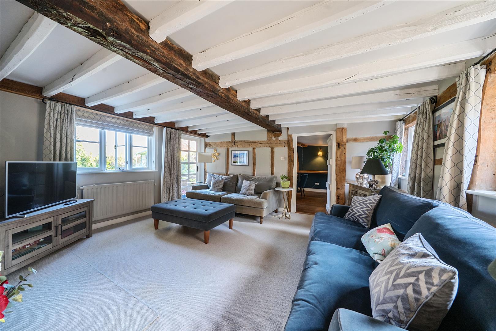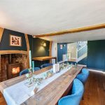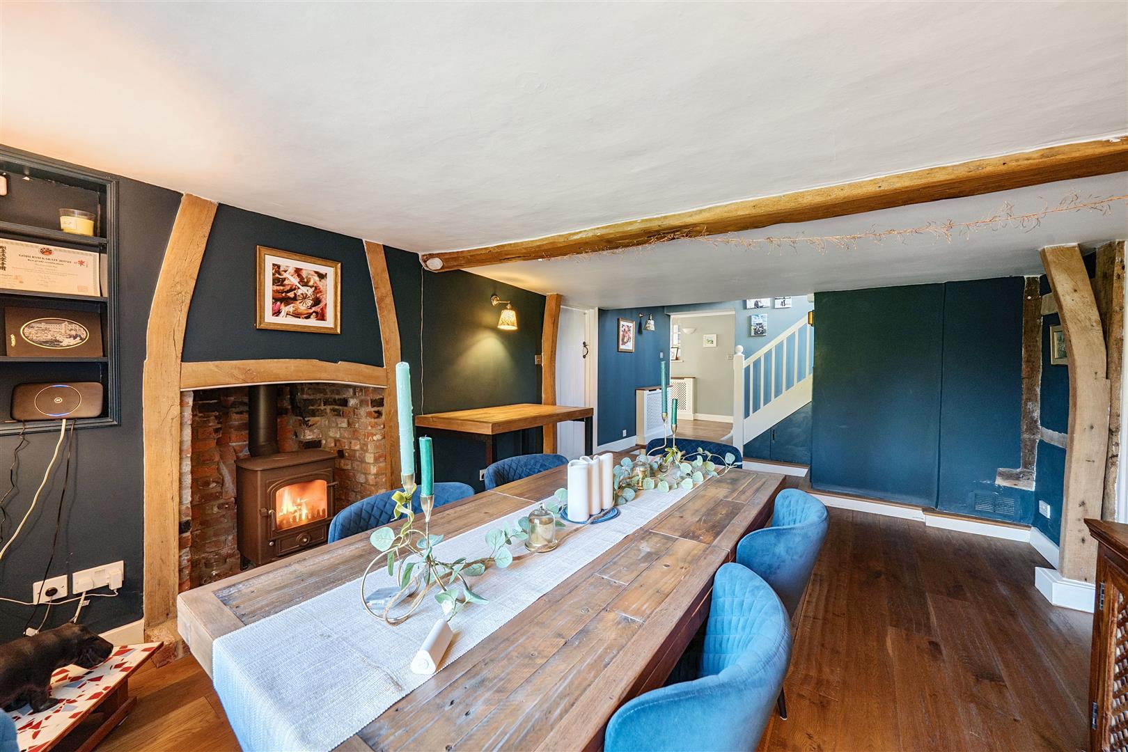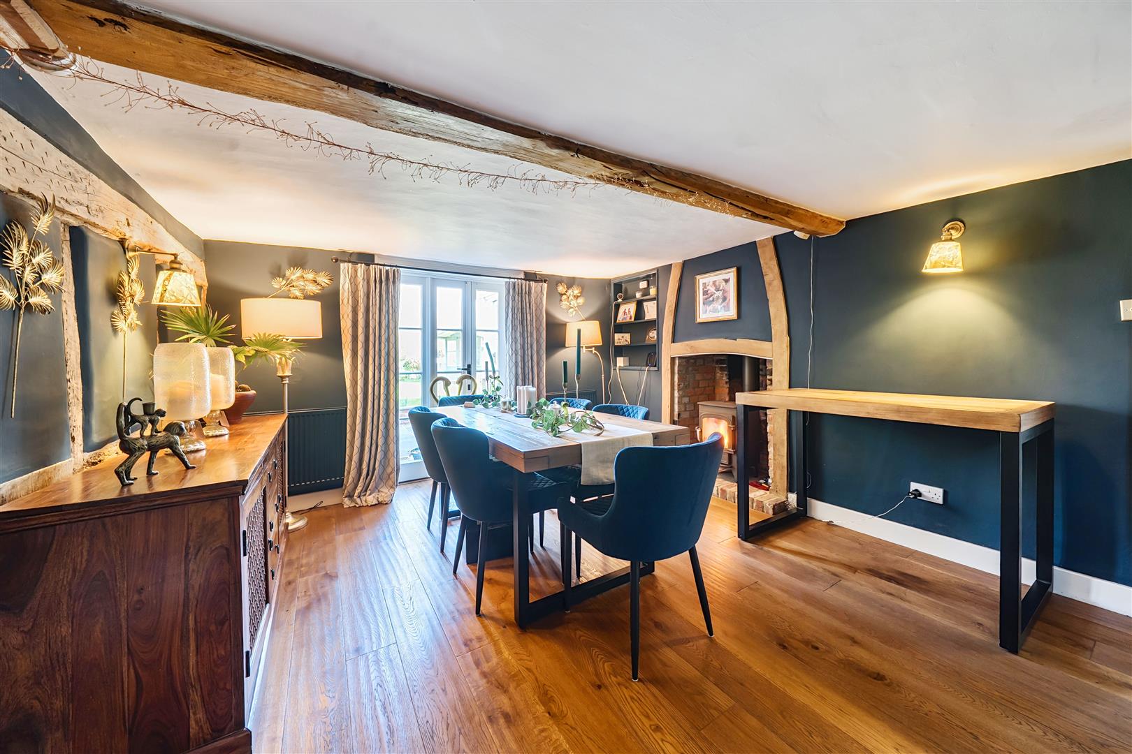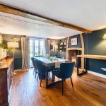 Upon entering the welcoming hallway with its elegant oak flooring, the warmth and character of Yew Tree House immediately embrace you. To the right, the heart of the home awaits—the delightful kitchen and family room, flowing through into the conservatory at the far end offering stunning views of the beautiful garden. The formal dining room, decorated in soft heritage tones, easily accommodates a table for ten, with a wood-burning stove for winter warmth and French doors that open onto the garden in summer. Beyond, the charming sitting room in the oldest part of the house is a perfect retreat, featuring a striking wood burner fireplace.