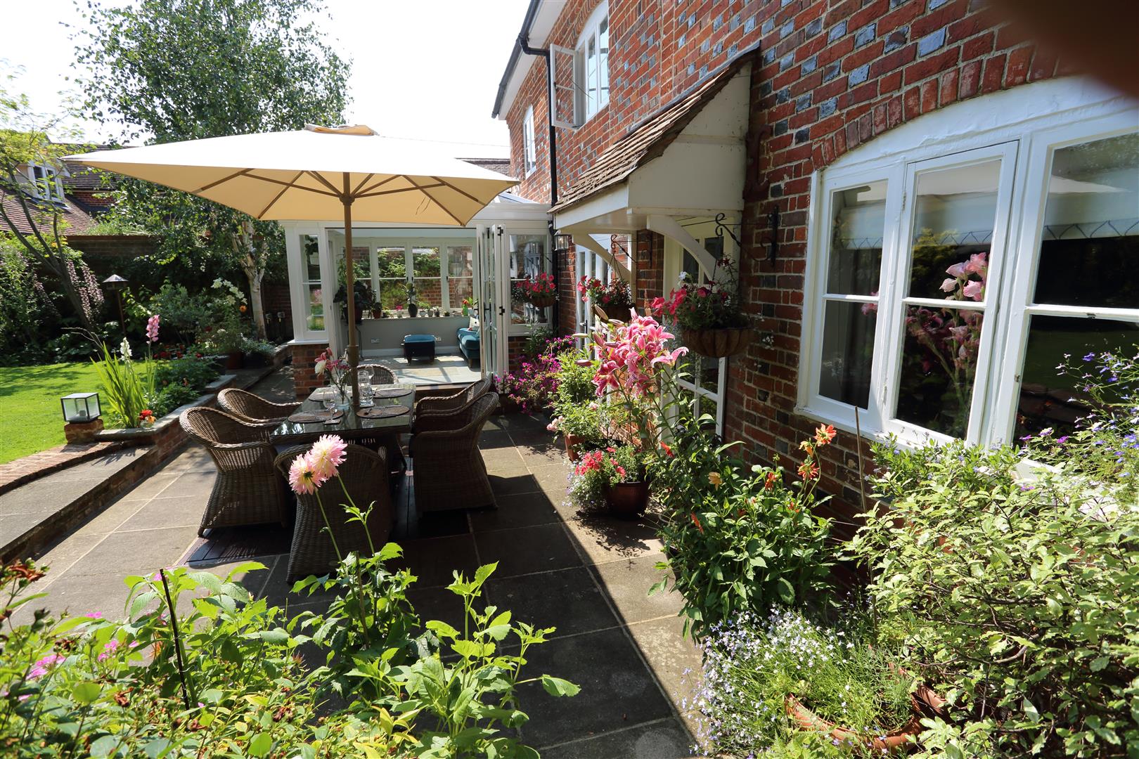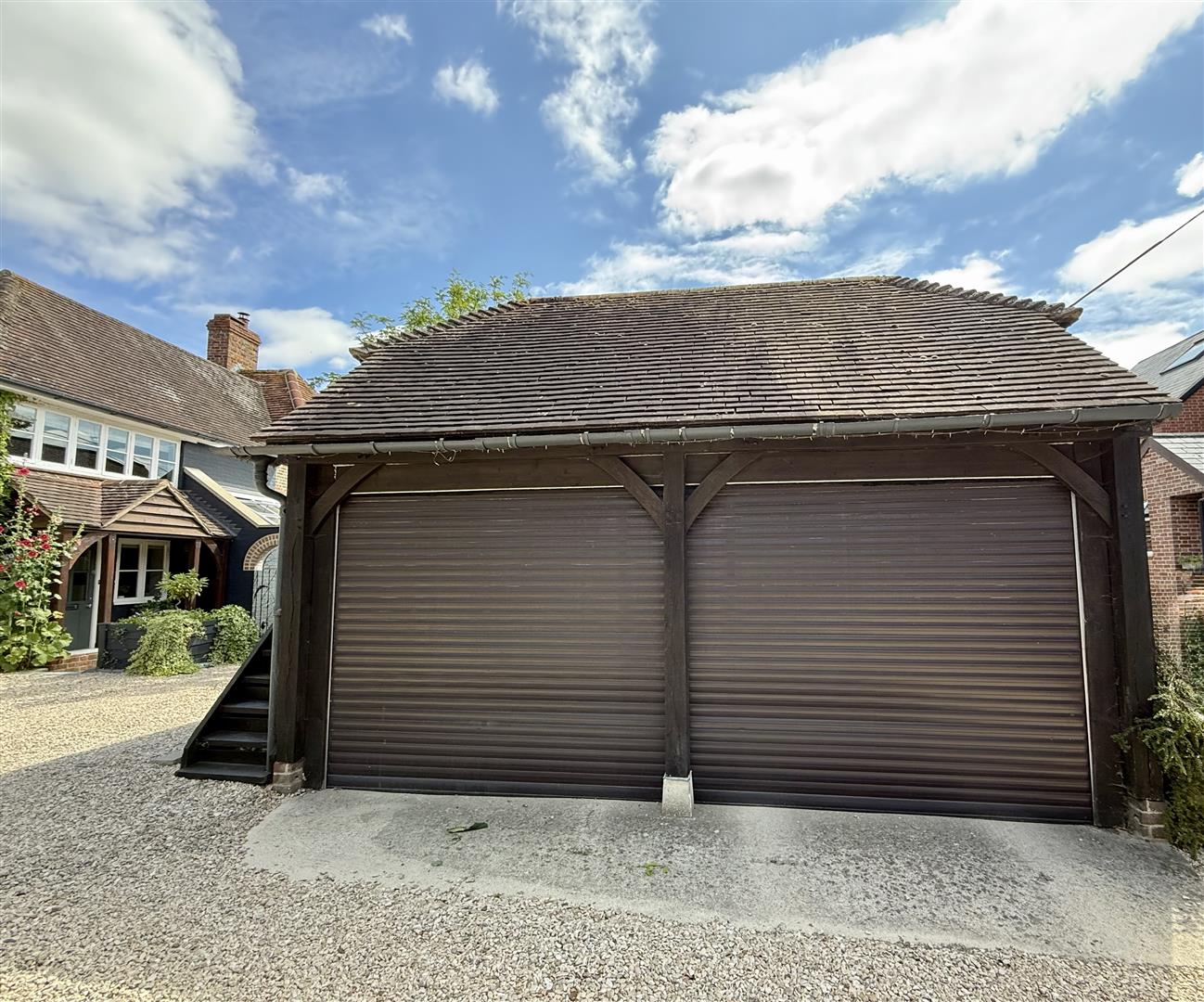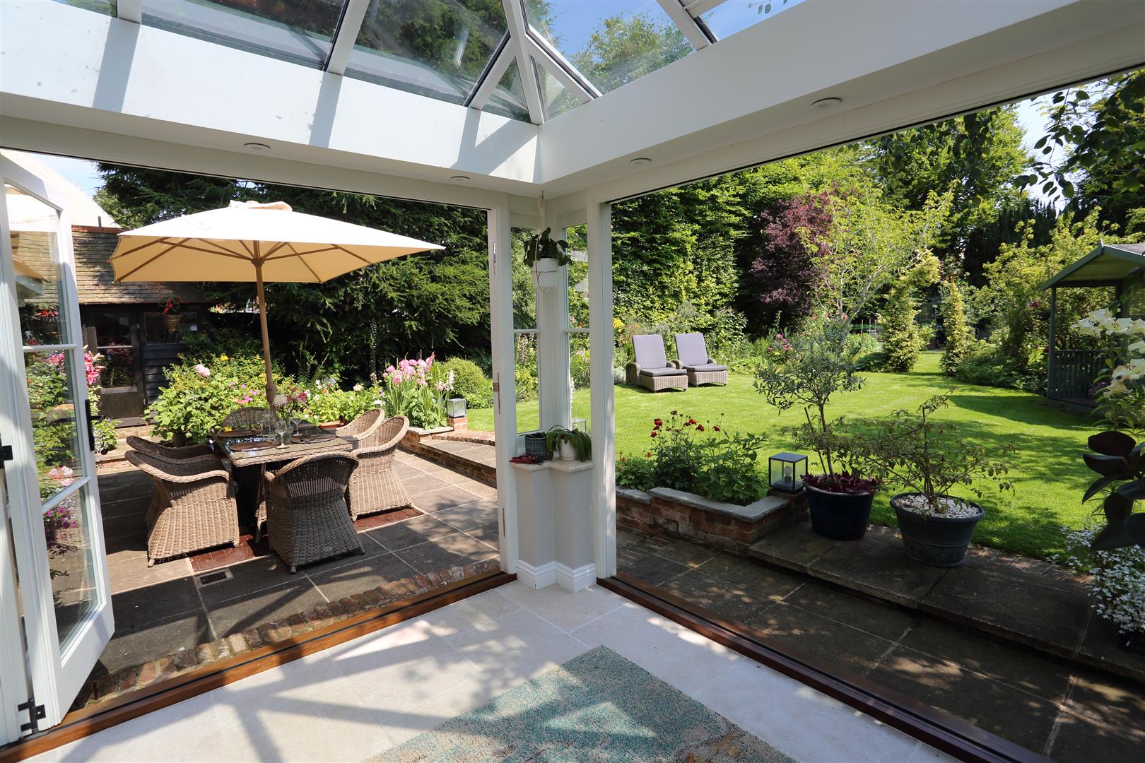 The garden comprises a generous lawn, summer house, potting shed and a sun-drenched terrace perfect for al-fresco dining. At the front, an oak-framed double garage provides secure parking and storage above, with additional space for three cars on the gravel driveway.