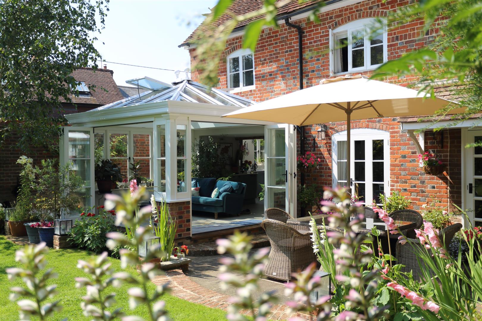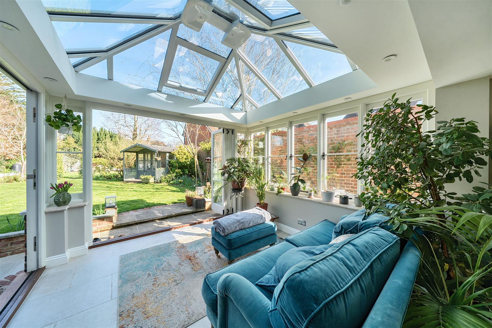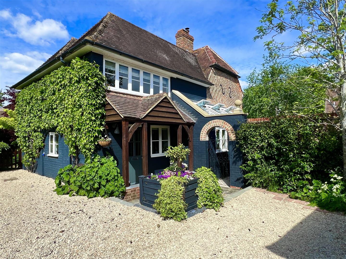 The garden comprises a generous lawn, summer house, potting shed and a sun-drenched terrace perfect for al-fresco dining. At the front, an oak-framed double garage provides secure parking and storage above, with additional space for three cars on the gravel driveway.